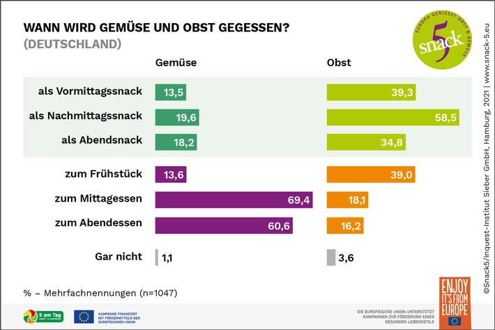 Die Kampagne Snack5 - Europa genießt Obst und Gemüse - wird mit Fördermitteln der Europäischen Union finanziert. Weitere Grafiken zur Studie stehen auf www.snack-5.eu/presse zu freien Verwendung im Rahmen der redaktionellen Berichterstattung unter Angabe der Quelle Snack5/ 5 am Tag e.V. zur Verfügung.