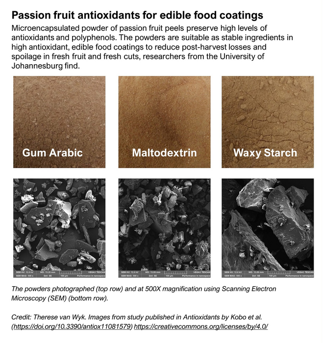 image: Microencapsulated powder of passion fruit peels preserve high levels of antioxidants and polyphenols. The powders are suitable as stable ingredients in high antioxidant, edible food coatings to reduce post-harvest losses and spoilage in fresh fruit and fresh cuts, researchers from the University of Johannesburg find. In this way, edible food coatings can contribute to food and nutrition security and environmental sustainability. view more